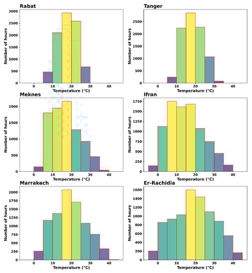 Furthermore, Figure 3 shows a distribution histogram of the ambient temperature according to the database for the six reference cities of climate zones of Morocco for one year. The ambient temperature in Rabat and Tangier varies between 10 °C and 25 °C, with a slight increase in Tangier during the summer, when it reaches 32 °C, which remains constant for most of the year. For Meknes city, the ambient temperature varies between 5 °C and 25 °C for 7092 h, representing 80% of the hours of year. However, in Marrakech city, this range of temperature variation extends to the high temperature, where we find that in 1097 h, the temperature increases by 30 °C. Where the temperature is below 10 °C, the numbers of hours exceed 3019. As illustrated in the histogram, Ifran has an extremely cold climate, and it also shows a significant temperature variation for Er-Rachidia city, which presents a desert climate known for a very hot summer and a very cool winter, where for 1988 h the temperature is lower than 10 °C and for 716 h it exceeds 35 °C.