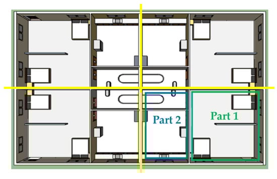 The selected building model for this study is a typical multi-family social residential building subdivided into four apartments (Figure 6). Each apartment can be separated into two parts. Part 1 is a large room of 42 m2, while part 2 contains the kitchen and the shower. The roof height is 5 m, and the floor area of each home is about 70 m2. The building elements were used as input data in the simulation model as internal gains.