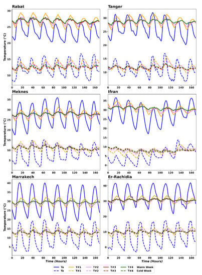 According to Table 7, for each investigated site and the winter’s coldest days, the outdoor temperature varies between 6 °C and 17 °C for the two coastal cities, Rabat and Tangier, and in the range of 2 °C to 15 °C, −1 °C to 13 °C, 2 °C to 20 °C and −3 °C to 13 °C for the cities of Meknes, Ifran, Marrakech and Er-Rachidia, respectively (Figure 7). This variation affects the temperature inside the buildings, where we observe that the amplitude of the variation in the interior temperature in the cities of Rabat, Tangier, Meknes, and Marrakech is between 10 °C and 16 °C. By contrast, in the two coldest cities, Ifran and Er-Rachidia, the temperature inside the buildings can decrease by up to 4 °C.