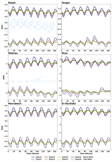 Figure 8 shows that the PMV indicator amplitude varies according to the construction type. As can be noticed, the PMV and the internal temperature of the buildings with construction types #3 and #4 are the same in summer, demonstrating a relationship between the two parameters. In fact, since the PMV is an indicator of the thermal sensation of the house’s occupants, if the temperature increases, the environment overheats and people feel more warmth. In other words, the PMV index increases. During the hottest week, the PMV indicator was between 1.1 and 1.8 for building types #2, #3, and #4 in the city of Er-Rachidia. This means the PMV = 2 value, corresponding to the feeling of harmful heat, was not exceeded in the analyzed points. Therefore, the microclimate of the room can be classified as moderate. Yet, for construction type #1, the PMV increases by 2, which means that the indoor climate is warmer. This figure also shows the PMV variation during the coldest period. The PMV values during this period are lower than −1 in all the evaluated cities and for all the proposed construction types, except for the city of Ifran, where they are lower than −2, which means freezing temperatures and high energy consumption for heating in this city.