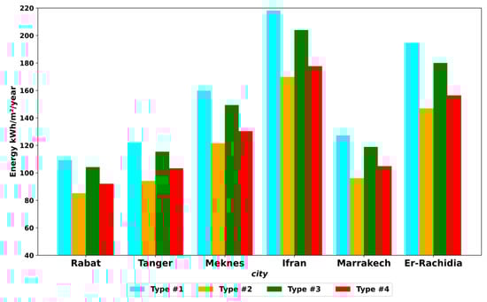 Figure 9 shows the graphs of the annual energy consumption needed to maintain an ambient temperature in the thermal comfort range, i.e., above 20 °C in winter and below 26 °C in summer. From this figure, we can notice that building type #1 has the highest overall thermal load, which exceeds 194 kWh/m2/year in Ifran (cold climate) and Er-Rachidia (desert climate), while it is about 160 kWh/m2/year for Meknes and 120 kWh/m2/year in Marrakech and Tangier. In contrast, it is nearly 109 kWh/m2/year in Rabat.