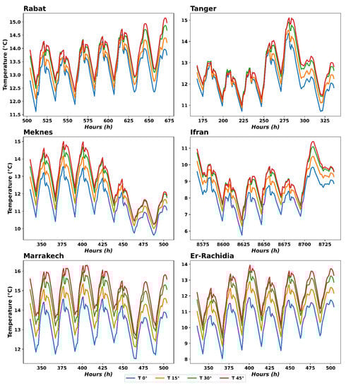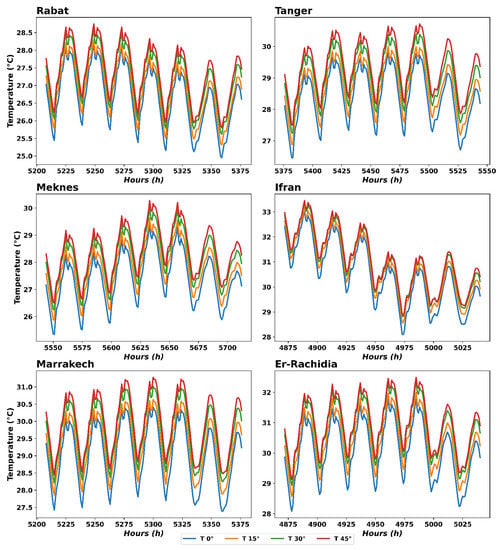 Figure 10 and Figure 11 represent the temperature variations inside this building during the coldest and warmest weeks and for the different slope angles. As the inclination angle increased, the temperature inside the building increased proportionally. This temperature increase can reach 10% in winter for the coastal cities, 16% for Meknes and Marrakech, and 19% and 22% for Ifran and Er-Rachidia for an inclination angle of 45°. This is mainly due to the concentrated solar flux amount received by the roof in winter. However, this increase does not exceed 5% for all the cities in summer.