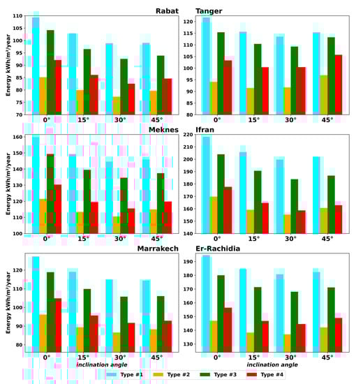 This variation impacts the temperature inside the building, which rises when the roof’s tilt angle increases, resulting in a decrease in the winter heating demand and an increase in the summer cooling demand. Therefore, the amounts of the energy variations (drop and increase) vary depending on the tilt angle. For example, building type #2 in Rabat city can save 6580 Wh/m2/year in heating energy with the 15° tilt angle. This value increases to 11,700 Wh/m2/year with the 30° angle and remains the same with the 45° angle. On the other hand, the cooling demand increases by 1380 Wh/m2/year, 3830 Wh/m2/year, and 6010 Wh/m2/year for the 15°, 30°, and 45° tilt angles, respectively, due to the rise in solar radiation captured by the roof and the increase in solar gains, which increase the indoor temperature. On the other hand, the total energy decreased by 5190 Wh/m2/year for a 15° angle, 7870 Wh/m2/year for a 30° angle, and 5510 Wh/m2/year for a 45° angle. We can see the same remarks for all the building types in all the studied cities, where the roof angle of 30° represents the low heating energy consumption.