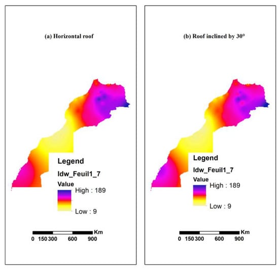 In order to present a clear configuration and ensure the visibility of our study results and to generalize our building configuration founding (Type #2) for all of Morocco, Figure 13 presents the spatial distribution of the annual thermal energy demand across Morocco for an apartment of type #2 with a horizontal roof and another one with a roof inclined with 30° and oriented to the south. The two maps show that the Atlantic and Mediterranean regions, known for their temperate winters, represent the lowest energy consumption in Morocco, while the regions with the coldest winters, such as the city of Ifran and the desert region, represent the highest energy consumption. All the cities also have reduced energy consumption when the roof is inclined. However, this reduction varies from one climatic zone to another depending on their geographical location and climate characterizations. According to the simulation results, the maximum annual thermal energy demand for the type #2 building with a horizontal roof is recorded in Figuig with 188.65 kWh/m2/year, followed by Ifran with 169.35 kWh/m2/year and Laanaceur with 142.9 kWh/m2/year. Conversely, the minimum annual thermal energy demand is found in Sidi Ifni at 12.47 kWh/m2/year, followed by Tan-Tan at 18 kWh/m2/year and Agadir at 38.61 kWh/m2/year. The common point between the above-mentioned cities is their location in climate zone 1.