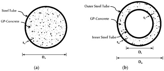 In the last twenty years, there has been a growing trend toward enhancing the compressive performance of structural members to keep up with cutting-edge engineering advancements [20,29,30,31,32]. Different strengthening configuration using FRP strengthening system has been studied [33,34,35]. Recently, concrete-filled columns have gained significant attention in the recent literature due to their efficient combination of reduced weight, exceptional bending stiffness, and superior cyclic performance [36,37]. The columns’ stiffness and strength can be further improved by utilizing ultra-high-strength concrete to fill the space between the inner and outer steel tubes [38]. The presence of ultra-high-strength concrete inside the column helps to delay or prevent buckling of the outer steel tube, while the outer steel tube effectively confines the concrete core. Columns with double concrete-filled tubes offer enhanced fire resistance compared to single concrete-filled tube columns, as the outer steel tube and shell concrete protect the inner steel tube [39,40,41,42]. These double-filled columns have attracted considerable attention in the form of experimental and numerical studies due to their advantageous engineering properties [43,44]. Despite the considerable benefits these double-section columns bring to composite construction, there is a notable scarcity of quantitative evaluations for such members in the existing literature [45,46].