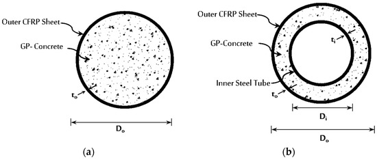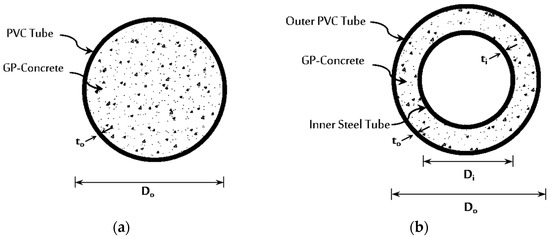 Seven GP circular columns’ behavior has been tested experimentally, which were set up to be investigated under axial compression loading. The Con-GP specimen (i.e., control column) had a 106 mm diameter and was 300 mm long. The other specimens’ diameters, however, varied depending on the confinement scheme based on the confinement scheme; for GP-CFST, GP-PVC, and GP-CFRP columns, respectively, it was 106 mm, 106 mm, and 102 mm. Table 5 gives the specifics of the circular columns. Letter strings with dashes between them represent the specimen IDs. The letter string Con refers to the control specimen; concrete-filled steel tube is referred to as CFST; S refers to solid columns without an inner confinement scheme; Ann refers to columns with an inner confinement scheme; PVC refers to PVC tube confinement at the outer diameter of columns; CFRP refers to the wrapping of a concrete column with CFRP sheet. A cross-section of all columns tested in this study is shown in Figure 5, Figure 6 and Figure 7. The first specimen (i.e., Con-GP) was the control column in this study. As shown in Table 5, the second and third columns (GP-CFST-S and GP-CFST-Ann) were utilized for investigating the influence of steel tubes on the improvement of the compressive capacity of columns under axial loading (see Figure 5). GP-PVC-S and GP-PVC-Ann, the fourth and fifth columns, were used to investigate the influence of utilizing PVC tubes as outer confinement, as shown in Figure 6. The sixth and seventh columns, GP-CFRP-S and GP-CFRP-Ann, were designed to investigate the strengthening of the control columns using CFRP sheets (see Figure 7).