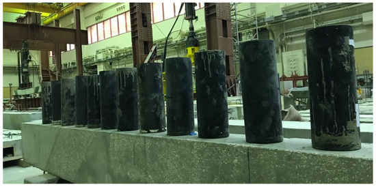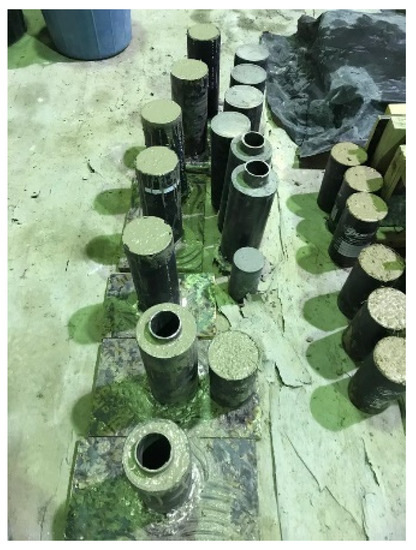 All of the specimens were cast, cured, strengthened, and tested in the structural laboratory at King Saud University. The steel tubes and the hollow PVC pipe were meticulously cut to lengths of about 300 mm in order to take a subsequent strengthening procedure into account. In order to possibly apply uniform axial pressure to the specimens’ upper surface, the top and bottom surfaces of the steel tubes were later formed perpendicular to the tube’s axis and flat. A crucial component for achieving an accurate assessment result is the leveled column ends [55,56]. After going through the forming procedure, the steel tubes’ exact final length was 300 mm. The interior and exterior surfaces of the steel tubes were meticulously cleaned to ensure that any dust or residues are entirely removed and that the concrete and steel tubes will come into the best possible contact. At the bottom surfaces of the tube sections (i.e., steel and PVC), flat, thick wood plates were placed to support the concrete during the casting processes. As depicted in Figure 8, silicon was utilized to connect the wood plates to the bottom surfaces of the hollow sections. After that, concrete was cast into the tubes and formwork. To reduce the possibility of compaction issues in the narrow shell and core areas of the different tubes, the casting procedure was meticulously carried out. The concrete surface was polished with a steel trowel after being cast to level the top surfaces of the columns. According to ACI-308R-01-R08 [57], the formwork was removed after 24 h, and the columns were moist cured for 28 curing days at lab temperature. First, water was misted onto the concrete surfaces. After that, burlap was used to cover the specimen. The burlap was then wet twice daily for the following few days. The CFRP wrap was placed manually via a wet layup process. Then, an epoxy-resin-soaked CFRP sheet was wrapped around the column surfaces. In order to avoid direct loading from the loading machine, the CFRP sheet has been wrapped along its entire length except for 5 mm from the two bottom surfaces of the GP-CFRP-S and GP-CFRP-Ann specimens. Prior to implementing the strengthening schemes, the surfaces of the specimens (i.e., GP-CFRP-S and GP-CFRP-Ann) were roughened using sandblasting to create an effective bond between the CFRP sheet and the core concrete surfaces. Before implementing CFRP jacketing, the surfaces of the concrete core were lightly scraped to eliminate the surface dust, and the dust was completely removed. In order to fill air gaps and create a solid bond, an epoxy primer coating was put on the exterior concrete core surface. Next, a very thin epoxy coat was applied to the concrete surfaces. The CFRP layer was then carefully wrapped after that. Making sure there were no air voids between the concrete’s surface and the CFRP sheet was crucial. All specimens are shown in Figure 9 before testing.