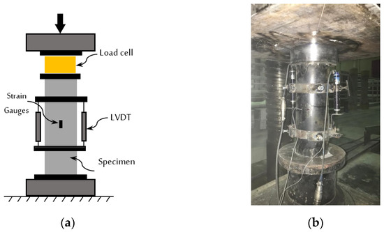 The specimens were compressed after 28 days of curing using a universal testing machine (UTM) with 1000 kN. Testing has been conducted via displacement control at a loading rate of 0.5 mm/min. Before the test, the two ends of the columns were leveled using a concrete end grinder to ensure an even distribution of the axial load on the column surface. In order to capture the attained load and displacement as well as the specimens’ strain, a data acquisition unit has been used throughout each test. For each of the specimens, two vertical linear variable differential transformers (LVDTs) were installed at mid-height around the columns’ perimeter to capture the deformation between the gauge lengths of 200 mm, as shown in Figure 10. For capturing axial strains in the loading process and revising LVDT readings earlier in the loading procedure, all specimens were equipped with two unidirectional strain gauges at mid-height, as shown in Figure 10. This is due to the fact that a resultant slack in the test setup frequently leads to inaccurate early-stage LVDT measurements. To measure the hoop strain of the PVC tube or the strain in the CFRP sheet, two uniformly dispersed, unidirectional strain gauges were installed at mid-height outside the designated overlap area.