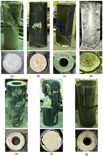 Failure modes of all specimens: (a) GP-Con; (b) GP-CFST-S; (c) GP-CFST-Ann; (d) GP-PVC-S; (e) GP-PVC-Ann; (f) GP-CFRP-S; (g) GP-CFRP-Ann.