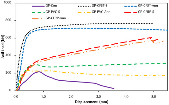 - The inclusion of inner steel tubes decreased the axial load capabilities of the columns. Compared to GP-CFST-S, GP-PVC-S, and GP-CFRP-S, the decreased ratios for GP-CFST-Ann, GP-PVC-Ann, and GP-CFRP-Ann were 6.9%, 25.1%, and 5.0%, respectively.