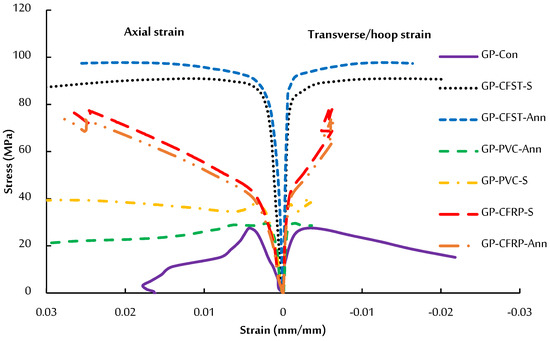 Under the effects of axial compression pressure, the specimens’ concrete cores began to crack. The confinement materials are put under lateral stress when the concrete dilates after it fractures. The axial pressure produced by the concrete core as well as hoop/transverse stresses led to it pushing outward against the various confinement walls. The various confinement walls (i.e., steel tube, PVC tube, and CFRP sheet) were subjected to biaxial pressure, and the concrete itself was subjected to triaxial constraint due to the confinement walls. The axial and transverse strain values and the stress results were combined to create the stress–strain curves, as depicted in Figure 13. At the middle point height of various confinement types, the specimens’ strain values were measured using axial (longitudinal) and transverse strain gauges. Throughout the initial loading phase, all strains increased linearly. Transverse/hoop strains on confinement walls during the elastic stage were remarkably low, as shown in Figure 13. This can be attributed to the fact that the axial compression load could be carried through the concrete core and confinement walls without any expansion in the concrete core. The strains on the outside various confinement walls gradually achieved yield strains as the load increased. When the stresses reached their maximum, the slope of the stress–strain curves began to decline, and almost all strain values surpassed the yield strain limitations. The findings show the use of different confinement components effectively supports the concrete core and improves the bearing capacity of the specimens. As shown in Table 7, the highest axial strains were recorded in the CFRP-wrapped columns (i.e., GP-CFRP-S and GP-CFRP-Ann); this can be attributed to the fact that the CFRP sheet usually fails in rupture without allowing large transverse deformations. Nevertheless, the highest transverse strains were recorded in the CFST columns (i.e., GP-CFRP-S and GP-CFRP-Ann) as a result of the steel tubes providing further confinement for the concrete core. Although it produced comparatively less confinement, PVC tubes provided a specific mechanism that evenly distributed the stress caused by the expansion of the concrete core, hence lowering the stress concentration due to the concrete being cracked asymmetrically [63,64]. The GP-CFST-Ann column had the maximum level of stress, as seen in Figure 13 and Table 7, compared to all other columns. The GP-CFST-S, GP-CFST-Ann, and GP-CFRP-Ann columns, therefore, experienced much more stress than any other specimen, proving that the confinement materials in those specimens generated more confinement strength prior to total failure. The findings demonstrated that, in comparison to the provided outer PVC tube and the CFRP sheet wrapped, the outer steel tube provided a greater confinement strength on the concrete core. Although the annular columns (i.e., GP-CFST-Ann, GP-PVC-Ann, and GP-CFRP-Ann) had smaller cross-sectional areas than the remaining columns (i.e., GP-Con, GP-CFST-S, GP-PVC-S, and GP-CFRP-S), the annular columns showed higher stress (up to 45.3%) than the remaining columns as a result of the presence of inner steel tubes. When the load level exceeded the maximum limits, the concrete expanded as a result of axial compression pressure, which enhanced the interaction between the two components. Additionally, the enhanced interaction has caused a rapid increase in the transverse strain and a reduction in the axial stress near the midpoint of the steel tube.