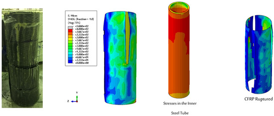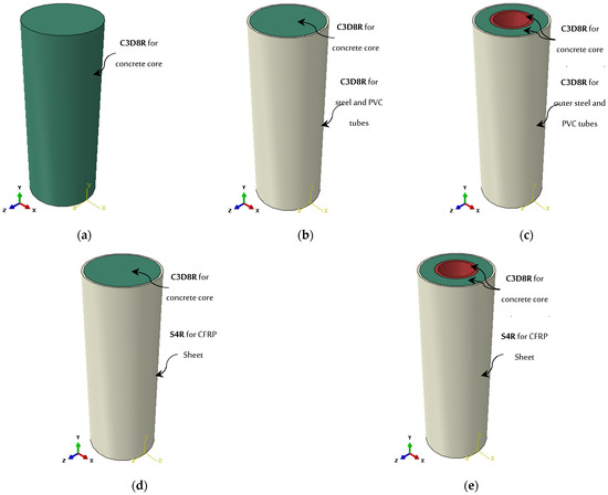 Continuum solid cube elements (i.e., C3D8R) were used to model the concrete core, as well as steel and PVC tubes. For the CFRP sheet, shell elements (i.e., S4R) were used. Figure 14 shows the element types used for all the columns in this study.