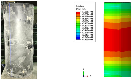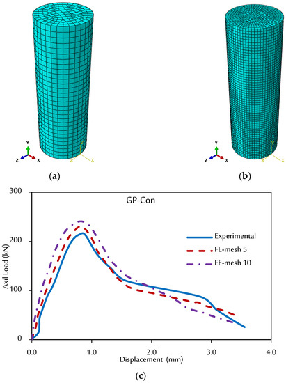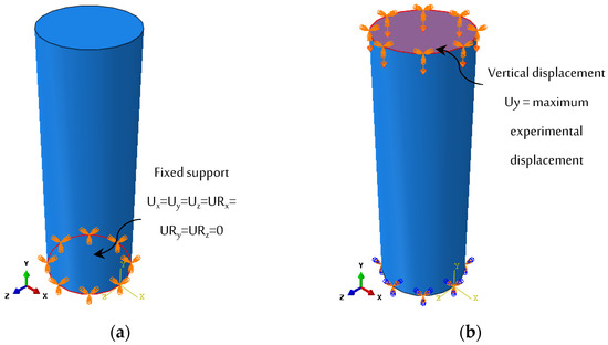 The axial compression loading was applied as a downward vertical displacement (i.e., displacement control) at the top surface of the columns, as shown in Figure 15b. The material density of all members was defined to simulate the members’ self-weight via the application of a gravity load in the ABAQUS software. As shown in Figure 15b, all degrees of freedom (i.e., DOFs) were restricted (i.e., fixed support) to the specimen’s bottom surface.