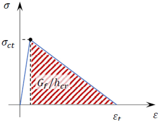 Table 8 summarizes the mechanical characteristics of all the materials used in the FE model, including the GP concrete and confinement materials (i.e., PVC, steel, and CFRP). According to Sharif et al. [66], the unconfined concrete characteristics created via the current experimental test (i.e., a compressive test of the concrete cylinder) need to be transformed into a confined stress–strain curve created by [63]. In this study, the concrete plasticity was modeled using the concrete damaged plasticity model (CDPM) from Lubliner et al. [67] and Lee and Fenves [68], which is currently available in ABAQUS and is widely used in FE modeling (e.g., REF). The parameters and in CDPM were set to 1.16 and 0.7, respectively. Additionally, the eccentricity parameter () and dilation angle () were defined as 0.10 and 38°, respectively. The splitting tensile strengths from Section 3.1 were used to compute the maximum tensile strength of concrete (), which is shown in Figure 16. As illustrated in Figure 16, the crack bandwidth () and fracture energy () were used to define the softening component, and the area under the softening segment was calculated by dividing the by the . For the GP concrete in this study, was calculated based on CEB-FIP Code [69] using the following Equation: