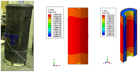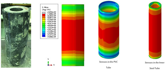 The steel material properties have been simulated as a nonlinear plastic model in order to accurately reflect the behavior actually based on the experimental results. In order to model the PVC’s plastic characteristics in the ABAQUS software, the experimental load–displacement curve (see Figure 4) was transformed into a stress–strain curve. The results of the experiment showed that tensile rupture caused the failure of the CFRP sheet. Regarding the CFRP composite, laminate modeling was used in the ABAQUS software. The testing results showed the strongest tensile strength in the direction of the fibers, whereas other strength values were low and were taken based on [27,70,71].