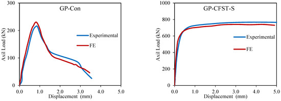 When circular columns of geopolymer concrete (GC) with fly ash and metakaolin are subjected to axially loaded conditions, they exhibit several key characteristics [22,47]. Firstly, due to the high compressive strength of GC, these columns can withstand substantial axial loads without significant deformation. Additionally, the confinement effect provided by the circular cross-section enhances the concrete’s load-carrying capacity and ductility. The less porous and denser geopolymer matrix than traditional concrete offers increased resistance to environmental factors that may otherwise lead to premature failure [48]. Furthermore, fly ash and metakaolin form a robust and cohesive binder system that improves overall durability [49]. Finally, it is important to note that the column’s load-carrying capacity can be further enhanced via steel reinforcement, such as by creating fiber-reinforced concrete (FRC) or concrete-filled steel tubes (CFST), depending on the specific design requirements and loading scenarios [50]. Ozbakkaloglu and Xie [51] tested 36 square fiber-reinforced polymer tubes with concrete under axial compression. These examples were made with OPC or fly ash-based geopolymer concrete. Composite column compressive strength was rarely affected by concrete type. Geopolymer concrete columns had lower ultimate axial strain than OPC reference samples. Shrinkage caused the stress–strain curves of OPC columns to plateau in the transition zones. Since geopolymer concrete shrank less, its curves did not have a plateau.