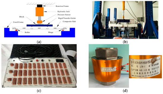 A 5000 kN universal testing machine was used to perform bending tests on laminated slab specimens. All stacked specimens were horizontally located and tested. The tests were performed on a portal counterforce frame with loading devices from top to bottom: hydraulic jacks, pressure transducers, distribution beams, and supports. The ATS380 test system was used to collect data [38]. The deflection, cracks, and strains of concrete, longitudinal reinforcement, and reinforcement of the specimens were mainly tested in the experiment. In the experiment, all the laminated specimens were supported by simple support and the flexural load was applied in the form of monotonic continuous graded load based on Code for Design of Concrete Structures (Chinese standard GB50010-2010) [26]. The loading devices are shown in Figure 4.