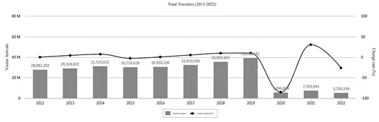 The gambling and tourism industries have always been the two main pillars of Macau. In 2006, the total revenue of Macau’s casinos surpassed that of Las Vegas, making it the world’s number one gambling city, known as the “Monte Carlo of the East” [51]. According to data from the Statistics and Census Service of the Macau SAR Government (Figure 2), the gross revenue from gambling reached 360.75 billion MOP during the peak period in 2013. In 2019, the total number of inbound tourists reached 39.406 million, with over 90% of tourists coming from mainland China, Hong Kong, and Taiwan. According to data from the Cartography and Cadaster Bureau of Macau, the total land area of Macau in 2023 is 33.3 square kilometers, with a population of approximately 680,000, making it one of the most densely populated cities in the world.