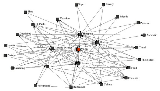 The analysis of high-frequency words in tourists’ perception of images reveals their focal points and preferences in city perception. Semantic network analysis of high-frequency words, visualized through a graph, further reveals the semantic relationships, conceptual relevance, and centrality among these words, providing a multi-dimensional understanding of their characteristics and semantic structure. Therefore, the 94 network comment texts in TXT format were imported into ROST CM 6.0 software for semantic network analysis, resulting in the generation of a semantic network graph of tourists’ perceptions of Macau’s city image (Figure 4). In the graph, lines connect the nodes, and the more lines connecting two nodes, the stronger their association. The distance between a node and the center indicates its centrality, with a shorter distance representing higher centrality and vice versa. It can be observed that the high-frequency words mainly point to words such as “Macau”, “historic district”, “heritage”, “shopping”, and “Grand Lisboa”, forming a layout with “Macau” as the main center and “historic district”, “heritage”, “shopping”, and “Grand Lisboa” as secondary centers. This indicates that tourists’ perception of Macau’s city image mainly revolves around their understanding of historical culture and tourism consumption. In addition, words such as “Ruins of St. Paul’s”, “Galaxy”, “Parisian”, “hotels”, “culture”, and “church” have a strong association with the central node, suggesting that tourists have a deep perception of certain representative landscapes in Macau’s city image.