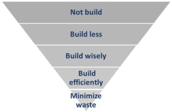 Environmental policies contributed to a decline in greenhouse gas emissions for construction operations between 2019 (9.6 Gt) and 2020 (8.7 Gt). Despite the slight reduction, however, the global account of CO2e emissions (directly and indirectly related to heating, cooling, lighting, etc.) from the construction sector, compared to the total, remains high at 37% [5]. The construction industry requires the extraction of large quantities of raw materials, with the consequent consumption of energy resources and release of pollutant emissions into the atmosphere. The pyramid in Figure 1 highlights the hierarchy of policy strategies to mitigate CO2e emissions from the construction sector; in the perspective of complete decarbonization, the best approach would be not to build at all, an unattainable goal that points us toward a construction model based on flexible design and removable and reusable structures. When not building is not feasible, we should build less, make better use of existing structures, repurpose waste materials, use low-carbon products, and create a construction design that minimizes waste through prefabrication, reuse, and recycling. It is possible to reach an efficient design and optimize structural solutions with effort.