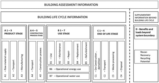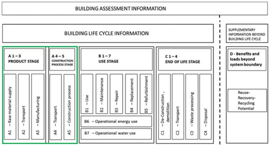 The LCA method makes it possible to identify steps with significant greenhouse gas emissions and intensive resource consumption. Therefore, careful LCA analysis can help preserve natural resources, mitigate climate change, improve air and water quality, and promote sustainable development. Adopting green approaches in product design provides economic benefits, meets the demand of environmentally conscious consumers, and complies with environmental regulations [6,7,8]. Life Cycle Thinking is applicable to all types of products. Fargnoli et al. [9] stressed the importance of integrating environmental aspects into product design, demonstrating the positive impact of reconditioning operations using life cycle simulation and product-service systems (PSS). The study on household dishwashers highlighted the benefits of the PSS approach on environmental performance, customer satisfaction, and company profitability. The LCA approach is recommended by several European policies, including the Integrated Product Policy [10]. This study uses two environmental indicators to quantify the impact, over the life cycle, of each case study: Operating Energy (OE) and Embodied Energy (EE). Embodied energy is that which materials need during their life cycle. Operational energy is the amount of energy needed in the utilization phase of the building. Embodied and operational energy factors correspond to CO2e emission factors: Embodied Carbon (EC) and Operational Carbon (OC) [11,12]. Open access databases containing information on embodied carbon and energy for various raw materials are critical to helping develop sustainability analysis tools based on energy use and emissions [13]. The European standard BS EN 15978:2011 [14] develops the life-cycle analysis methodology for assessing the environmental performance of buildings, outlining five key blocks: Production, Construction, Use, End of Life, and Benefits and Loads (Figure 3) (Table 1).