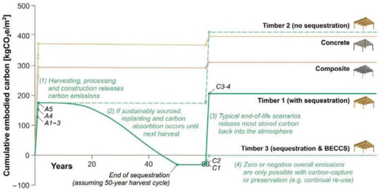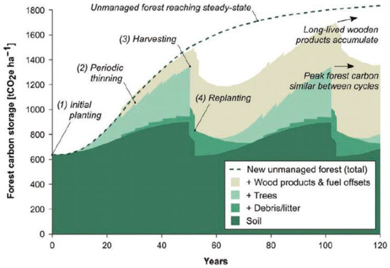 Cultivating trees and using wooden buildings as carbon sinks is a potentially significant strategy, but it raises questions about the environmental impact of timber and forest growth. Hawkins’ [16] comparison of a commercially managed Sitka spruce forest with an unmanaged forest reveals that carbon absorption in newly planted trees begins slowly but increases over time (Figure 4). Unlike unmanaged forests, which reach a peak and stabilize, managed forests continuously accumulate carbon, although with shorter harvesting cycles. Moreover, storing carbon in wood products significantly contributes to overall carbon sequestration, surpassing the levels found in unmanaged forests [17].