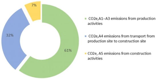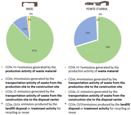From the observation of the pie charts (Figure 17), it is evident that the emissions generated by the processes aimed at recycling construction waste have a very minimal impact on the total CO2e, A5w. These emissions are present in such small quantities that they do not appear within the diagrams.