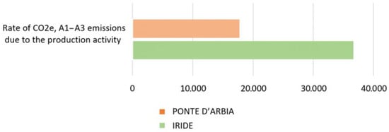 Rate of CO2e, A1–A3 emissions of the Iride kindergarten and the Ponte D’Arbia kindergarten.