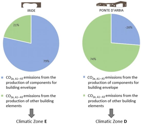 Rate of CO2e, A1–A3 emissions of the Iride kindergarten (left) and the Ponte D’Arbia kindergarten (right).