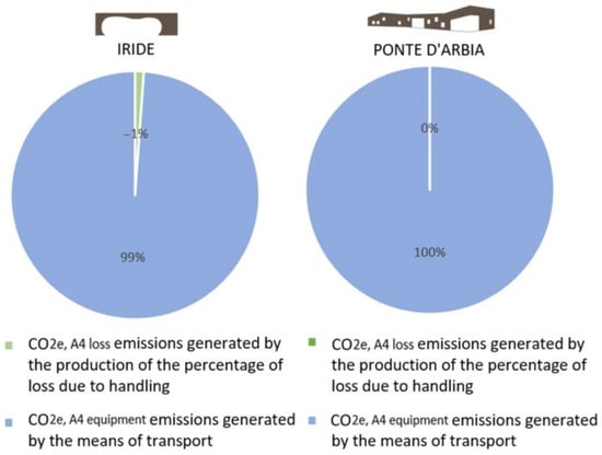 Regarding the emissions related to the transportation of the elements, it is important to note the negative value of those caused by producing transportation losses for the Guastalla kindergarten (−0.016 kg CO2e). In this school, among the elements considered vulnerable to transportation damages, the industrial parquet is to be mentioned as it has an embodied carbon ICE coefficient of −0.81 kg CO2e/kg, considering the carbon storage property of wood. For the Ponte d’Arbia kindergarten, no element was considered vulnerable to handling damages; therefore, the emissions generated during production due to losses are zero (Figure 14).