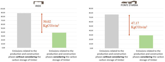 Results for the Iride kindergarten (left) and the Ponte D’Arbia (right) were obtained considering and not considering the compensatory emission credit for carbon storage in timber.