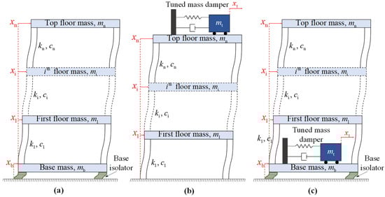 Schematic diagrams of multi-story structures with (a) base isolation system (BIS), (b) tuned mass damper (TMD), and (c) hybrid vibration control system comprising BIS and TMD.