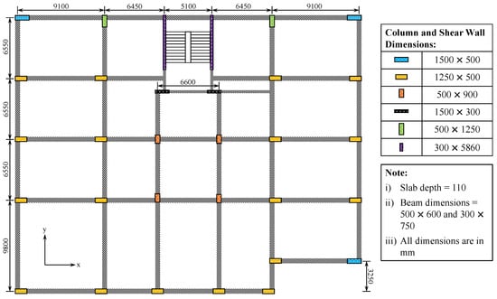 Figure 2 shows the plan of a typical floor of the ward block of the considered hospital building in Dwarka, also mentioning the details of the structural members []. Since the current study only deals with one ward block of the hospital, henceforth in this article, this specific building is referred to as the Dwarka Hospital building. The Dwarka Hospital building is an eight-story reinforced concrete (RC) structure with two additional basement stories. The isolators are placed at the ground level, and the required moat width is maintained around the ground floor level for the proper functioning of the base isolators. The first two stories of the superstructure have a height of 4.05 m, the top story has a height of 3.85 m, and all the remaining stories are of 3.9 m height each. The building is almost rectangular in plan with a small setback in one corner. The exact details of the various structural members of the building including their placement in plan are shown in Figure 2. The 28-day characteristic compressive strength of concrete of the beams and slabs is 25 MPa and of the columns and shear walls is 30 MPa.