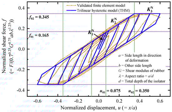 In this study, it is intended to utilize a highly flexible isolation system such that the reduced dynamic response of the Dwarka Hospital building will never be intolerable to the inhabitants, even during the earthquake excitation []. In order to achieve response reductions of such magnitude, UFREIs are utilized for the seismic isolation of the Dwarka Hospital building. The nonlinear force–deformation behavior of the UFREIs is modeled by Banerjee and Matsagar [] utilizing the trilinear hysteretic model (THM). In [], it is observed that the force–deformation behavior of the UFREI can be represented with the help of three distinct stiffnesses at different levels of horizontal displacements. The behavior of the THM is predominantly governed by the amount of rollover displacement induced in the UFREI with respect to the total side length of the isolator. Figure 3 demonstrates the efficacy of the THM in modeling the nonlinear force–deformation behavior of the UFREI. Also, Figure 3 provides various properties of the normalized THM which could be utilized in the design of an UFREI-based isolation system under any site-specific scenario. From Figure 3, the three linear stiffnesses of the normalized THM are obtained as: