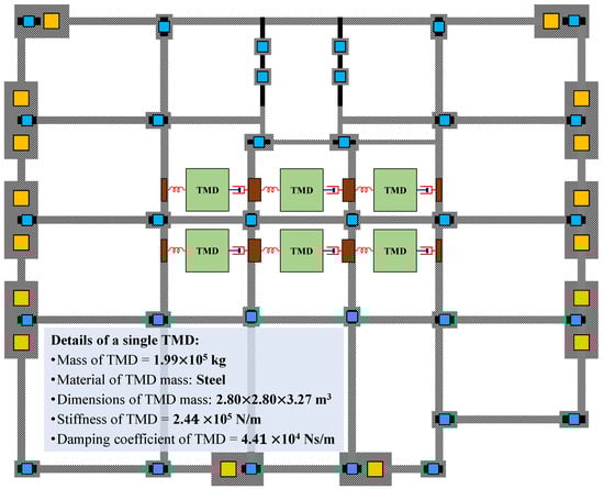 Here, , , and denote the mass, damping coefficient, and the stiffness of the TMD, respectively. It should be noted here that the TMD properties in Equations (9)–(11) are the combined properties of all the TMDs, i.e., the summation of the individual TMD properties shown in Figure 6. Here, and simply have an additional DOF with the same values as the rest of the superstructure. Ultimately, Equation (8) is solved to evaluate the site-specific seismic response of the controlled structure with UFREI and TMD.