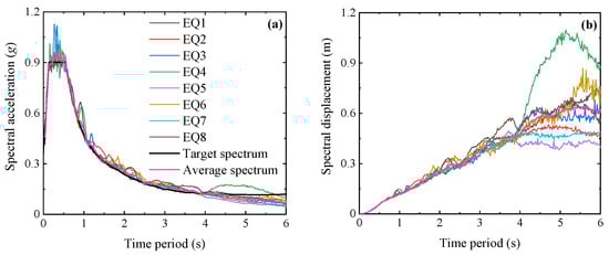 The design basis earthquake (DBE) conditioned response spectrum is multiplied by a factor of two to obtain the target spectrum for the MCE scenario. The response spectra of the selected earthquake records are scaled to match with the target spectrum using the software, SeismoMatch (Version 2022, Release 1) []. The details of the eight considered ground acceleration records are presented in Table 1. Figure 7 shows the (a) acceleration and (b) displacement response spectra of the scaled ground motion records according to the site-specific earthquake scenario. It is observed from Figure 7 that the scaled earthquake ground motions have closely matched with the target spectrum, thus ensuring the site-specific earthquake condition.