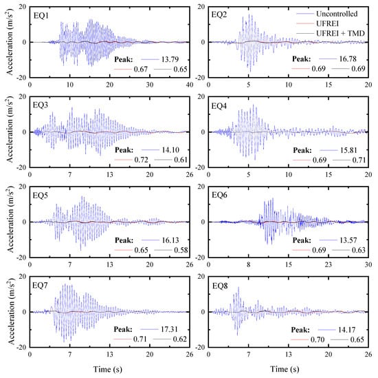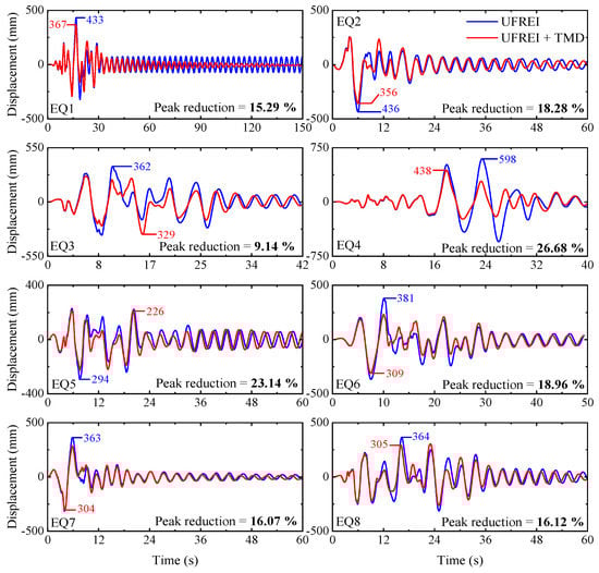 As seen from Figure 8, the peak acceleration responses of the UFREI-isolated structure and the UFREI-isolated structure with TMD are both substantially below the stated limiting value, which justifies the design of such flexible isolation systems. Figure 8 also reveals that the response of the UFREI-isolated structure and the hybrid (UFREI and TMD)-controlled structure are comparable to each other with minimal visible differences. This implies that the addition of the TMD to the isolated structure does not increase the acceleration response of the structure. In fact, it is seen from Figure 9 that the acceleration response of the structure actually decreases under most of the earthquakes due to the addition of the TMD to the UFREI-isolated structure. Such low levels of acceleration also ensure continued functionality of acceleration-sensitive machines and equipment contained within the building, which are common commodities in hospital buildings.