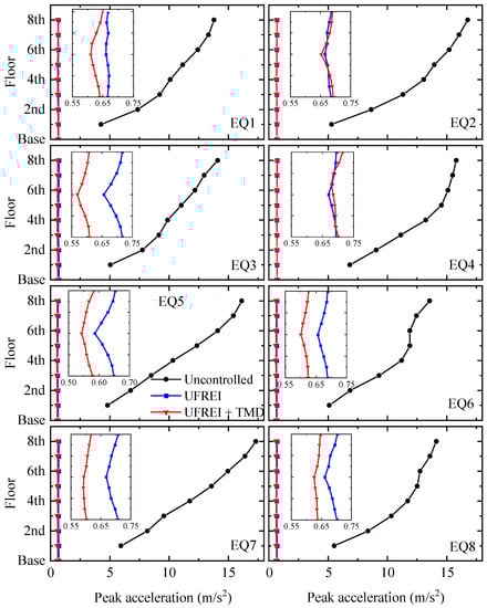 Figure 9 presents the peak acceleration responses of all the floors of the eight-story hospital building, when the building is (a) uncontrolled, (b) UFREI-isolated, and (c) hybrid-controlled using UFREI and TMD. It is observed that the peak acceleration response of the uncontrolled building at each floor has reduced significantly due to both the UFREI-based isolation system and the hybrid (UFREI and TMD) control system. Although the peak acceleration responses of all the floors have minimal variations using TMD with base isolator when compared to using only the base isolator, the hybrid (UFREI and TMD) control system has been effective in further reducing the responses of the base-isolated structure slightly under all the earthquakes, except EQ2 and EQ4 (Figure 9). This implies that apart from reducing the base displacement of the isolated Dwarka Hospital building, the TMD could also minimally reduce the acceleration response of the isolated superstructure, which is an added advantage in the installation of the TMD.