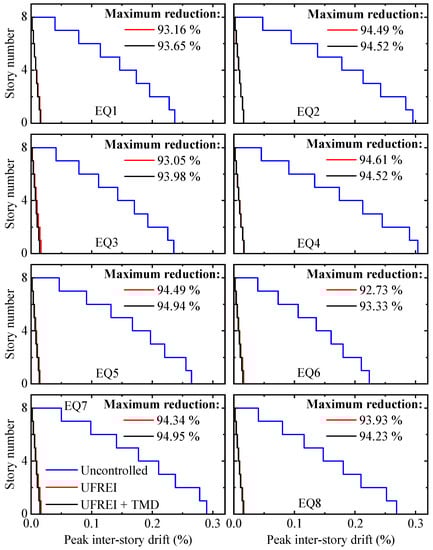 The performance of structures under seismic excitations are often measured with the help of peak inter-story drifts experienced by the structure. Therefore, Figure 10 shows the peak inter-story drift response of the (a) uncontrolled, (b) UFREI-isolated, and (c) hybrid (UFREI + TMD)-controlled Dwarka Hospital building, when subjected to the various site-specific earthquake excitations. Interestingly, it is observed that due to adoption of such stringent structural acceleration limit for the design of the BIS, the limit for serviceable condition based on the peak inter-story drift has automatically been taken into account. According to Galambos and Ellingwood [], the maximum allowable inter-story drift for serviceable conditions in buildings is 0.1%. It is seen from Figure 10 that the controlled peak structural inter-story drifts are much lesser than 0.1% using both only the UFREI-based isolation system and the UFREI-based isolation system with TMD. Here too, differences between the response of the UFREI-isolated structure and the hybrid-controlled structure are rarely visible. Having said that, the performance of the hybrid (UFREI and TMD) control system is slightly better than that of the isolation system alone in most of the cases. Also, the reductions in the peak base shear of the Dwarka Hospital building are observed to be higher than 90% under all the site-specific earthquakes (results not included here) using both systems, (a) UFREI-based isolation system and (b) hybrid (UFREI and TMD) control system.