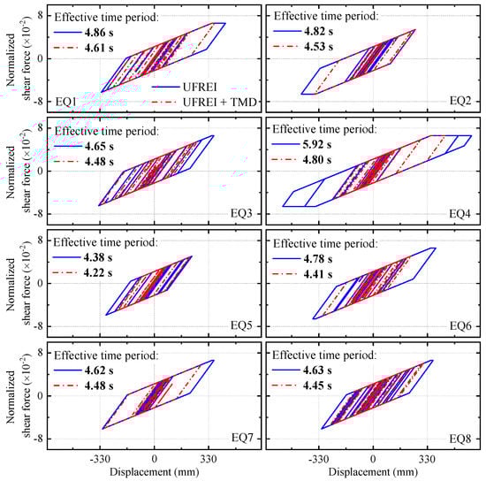 Figure 12 shows the force–deformation behavior of the UFREI-based isolation system under the various site-specific earthquakes, when the Dwarka Hospital building is (a) only base-isolated and (b) equipped with BIS and TMD. It is observed that the designed isolation system is effective in achieving the required structural performance because the UFREI-isolated Dwarka Hospital building has shown an effective isolation time period in the range of 4.4 s to 5.9 s under the various seismic excitations. Nevertheless, the UFREI-based isolation system did not experience large displacements under all the considered earthquakes, thus displaying a bilinear force–deformation behavior wherever the isolator displacement did not exceed the second yield displacement of the designed isolation system. Further, when the TMD is added to the UFREI-isolated Dwarka Hospital building, the isolator displacements have reduced significantly, which is also reflected in the force–deformation behavior of the UFREI-based isolations system. The modified effective time periods of the controlled structure have been obtained in the range of 4.22 s to 4.80 s under the various earthquakes, due to the addition of the TMD. Having said that, the reduction in the effective time period of the isolated structure does not translate into its structural dynamic response as observed from Figure 8, Figure 9 and Figure 10. This summarizes the effectiveness of the hybrid vibration control system using the UFREI-based isolation system and the TMD. Although the restoring force exerted by the flexible UFREI-based isolation system is lesser as compared to conventional isolation systems, it is found that the maximum residual displacement in the UFREI-isolated structure is within 5 mm (i.e., 0.83% of the maximum displacement, 598 mm), and the hybrid-controlled structure is within 19 mm (i.e., 4.35% of the maximum displacement, 438 mm), under the various site-specific earthquake excitations. Therefore, it could be concluded that the restoring forces exerted by the isolation system is enough to avoid any significant residual displacements in the base-isolated or the hybrid-controlled structure.