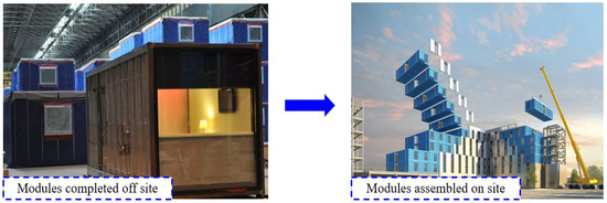 Modular steel buildings, which divide traditional architectural connections into three-dimensional modular units, represent an advanced stage in the development of the construction industry. Multiple room-sized modules are prefabricated in factories and transported to the site; they are then hoisted to form a whole structure [1,2,3,4,5], as shown in Figure 1. The method of constructing modular steel buildings has significant technical advantages because of its faster construction speeds, quality assurance, low labor costs, low levels of environmental disturbance, and convenience in recycling as compared to traditional concrete buildings [6,7,8]. However, in some cases, the disadvantages of modular steel buildings can outweigh the advantages; these disadvantages include special design requirements, limited customization options, and high initial investment costs. If the project requires a unique design, customization needs, or greater design freedom, traditional building methods may be more suitable. In addition, modular steel buildings can require significant initial investments, which may impact projects with limited budgets. Therefore, modular steel buildings have become popular and promoted as buildings with repetitive architectural plans and structural layouts, where the advantages of modular construction can be maximized.