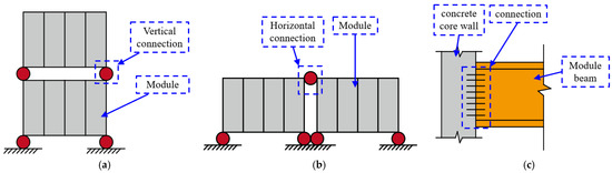 The inter-module connection provides a path for load transfer and sharing between modules, which allows the modules to effectively transfer loads to the foundation. Thus, the seismic and bending performance of inter-module connections is crucial. Inter-module connections can be classified as vertical connections, horizontal connections, and module-to-concrete-core connections, as shown in Figure 3. A vertical connection is the connection between modules from different layers, which uses column–column or beam–beam connections. A horizontal connection refers to the connection between adjacent modules from the same layer, which is accomplished by using end plates or plug-ins to connect the columns of adjacent modules together. The connection between the modules and a concrete core wall involves using the concrete core tube as a supporting structure and assembling multiple modules to form an entire building. This type of structural system efficiently resists the lateral force. Generally, vertical and horizontal connections remain a hot topic in the research of inter-module connections. However, the module-to-concrete-core-wall connection is less commonly used in modular buildings due to the larger casting of concrete, which is not in line with the development of modular steel buildings.