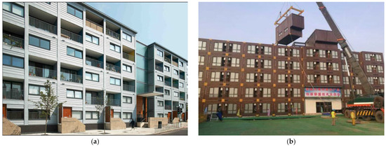 Modular construction of mid-to-high rise buildings. (a) 6-story apartment in the UK; (b) 5-story dormitory in China [23]; (c) 32-story apartment in the USA; (d) 13-story residence in Japan.