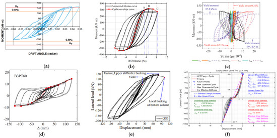To evaluate the overall seismic performance of modular steel buildings under cyclic loading, the component should have sufficient energy dissipation capacity to ensure the safety of the building [68]. Lee et al. [40,41] observed that installation of a shim plate increased the energy absorption capability or the area of the hysteresis curve, as shown in Figure 7a. Dai et al. [36] proposed a self-locking connection; for specimens with rib stiffeners, the hysteresis curve appears fuller, as shown in Figure 7b. Zhai et al. [47] found that the strain gauge reading at the beam end in the joint domain indicates the protective effect of the diagonal stiffening ribs. Large strains were concentrated at the flange positions of the diagonal brace reinforcement; this was caused by the force transfer between the beam-columns along the diagonal braces, as shown in Figure 7c. A new vertical post-tensioning connection was proposed by Sanches et al. [32], who found that the hysteresis curve became narrower as the post-tension load level increased, as shown in Figure 7d. Chen et al. [49] carried out cyclic load tests on QS3 specimens with stiffening ribs; the yield strength and corresponding lateral displacement were 80 kN and 22 mm, respectively. At the end of this cycle, the column end load dropped to 134 kN, which is approximately 85% of the maximum load, as shown in Figure 7e. Srisangeerthanan et al. [35]. applied cyclic shear loads to this innovative connection. The cyclic behavior of the system was satisfactory, and the overall response was elastic, as shown in Figure 7f.
