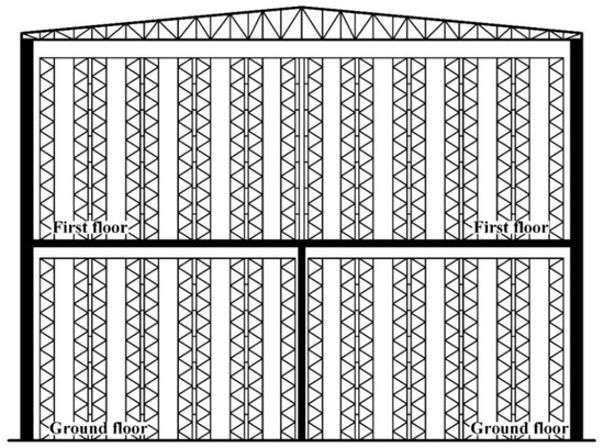 In recent years, a large number of two-story warehouses have been built in China, as shown in Figure 1. The warehouse height can reach 20–25 m, and the story height is about 10–12 m. The cold-formed steel storage racks are installed on the ground and the first floor to make effective use of precious spaces.