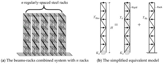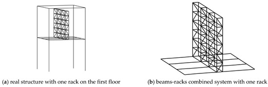 As shown in Figure 2a, the period of an independent rack fixed on the ground is TRk. When this rack is installed on the first floor of the main structure (Figure 3a), the beams become the elastic support of the racks. As a result, the period of the rack installed on the first floor will change. Therefore, a combined system consisting of floor beams and racks can be constructed with the beams being fixed, and the period of this beams-racks combined system is denoted by , where the subscript n represents the number of racks. The combined system with one rack is shown in Figure 3b and the period is .