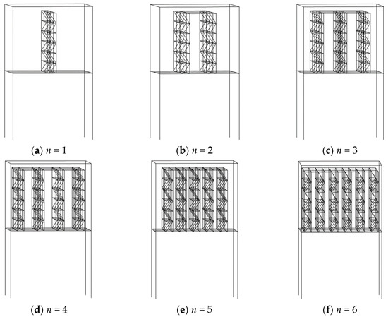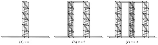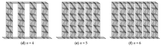 As the number of racks increases from 1 to 6, different beams-racks combined systems are shown in Figure 4. The connections between the racks at their tops ensure that all racks in the combined system vibrate in the same first vibration mode, as shown in Figure 5. It can be seen that without considering the influence of floor beam stiffness (), the number and the arrangement of racks do not affect the modal shape of beams-racks combined systems, and the periods of the six combined systems are the same, i.e., . Therefore, the vibration characteristics of the combined systems with n racks are consistent with those of the combined system with one rack whose masses and stiffness are multiplied by n (Figure 6).