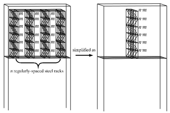 The racks may increase the stiffness of the first floor, and this can be studied using the new model shown in Figure 21. This modified model reserves the racks but integrates the total mass of the racks into the first floor of the real structure. This modified model is distinguished from the simplified structure in Figure 2c by taking into account the effect of the no-mass racks, so the period of this modified model is denoted by . Therefore, the analysis of the influence of the racks on the main structure can be obtained by comparing the periods of the simplified structure (TSS) with the periods of the modified model ().