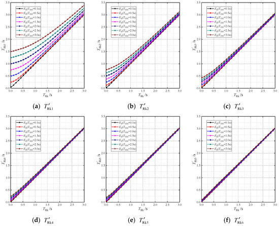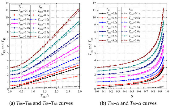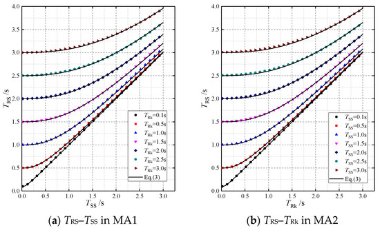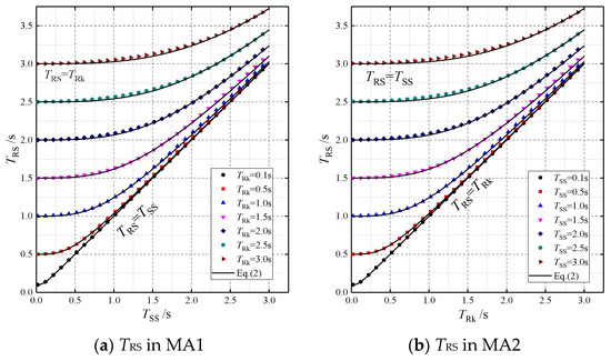 From the curves in Figure 7a, it can be seen that for different TRk, each TRS–TSS curve starts at TRS = TRk and gradually increases to the straight line of TRS = TSS with the increase of TSS. For = 0.1 s, the curve is basically coincident with this straight line. The curves in Figure 7b obtained in MA2 assume a similar pattern: each TRS curve starts at TRS = TSS and gradually increases to the straight line of TRS = TRk with the increase of TRk.
