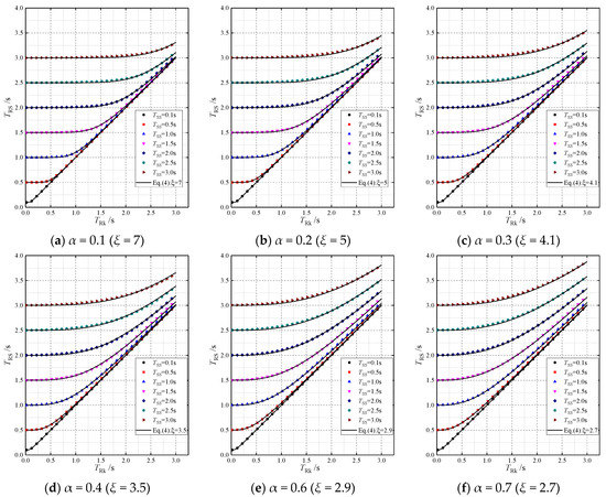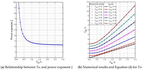 The numerical results of TRS and TSS in Figure 12 can also be used to validate Equation (4). Based on the corresponding relationship between TRk and α in Figure 11, the power exponent ξ in Equation (4) can be obtained by Equation (5), as shown in Figure 13a. Therefore, the periods TRS of real structures can be calculated using Equation (4) () and plotted in Figure 13b. The TRS–TRk curves obtained from Equation (4) are in good agreement with the numerical results, with a maximum deviation of 0.6%.